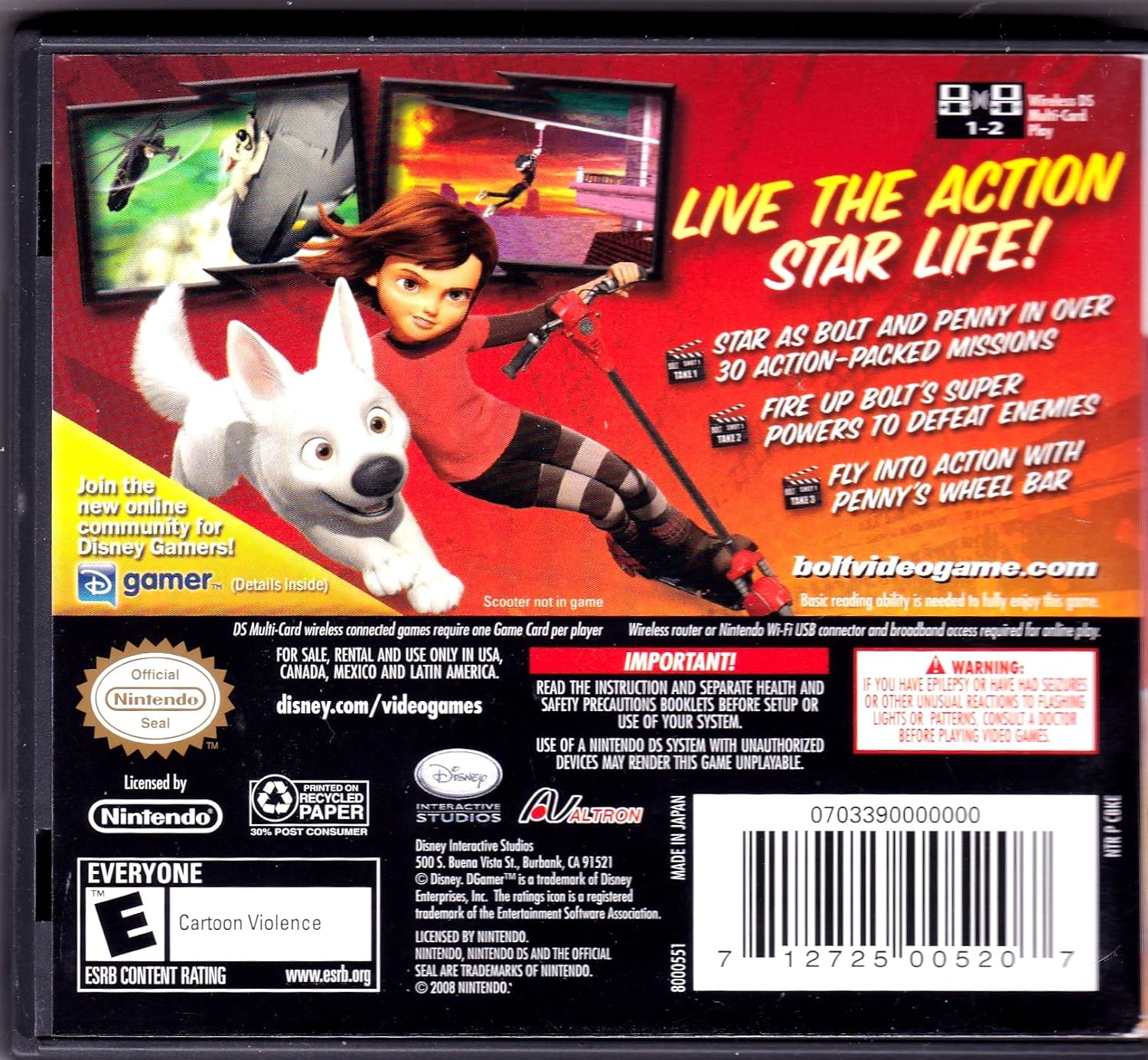 In Disney's Bolt, players take on the heroic personas of the TV star dog, Bolt, and his owner, Penny, from the high-action television series featured within the film. As Bolt, players can use his superpowers, including laser vision and his superbark, which sends out a sonic blast to devastate opponents, and as Penny, players utilize stealth, hacking skills and a wheelbar, inspired by her scooter seen in the movie, to outwit enemies. In addition, the Nintendo DS version includes competitive and co-op multiplayer, mini games as well as DGamer, Disney Interactive Studios' innovative new technology that provides a fun, connected game community for Disney video game fans. With DGamer, players earn content, interact and chat with others on Nintendo DS through the Nintendo Wi-Fi Connection or on a computer through the Disney.com website.