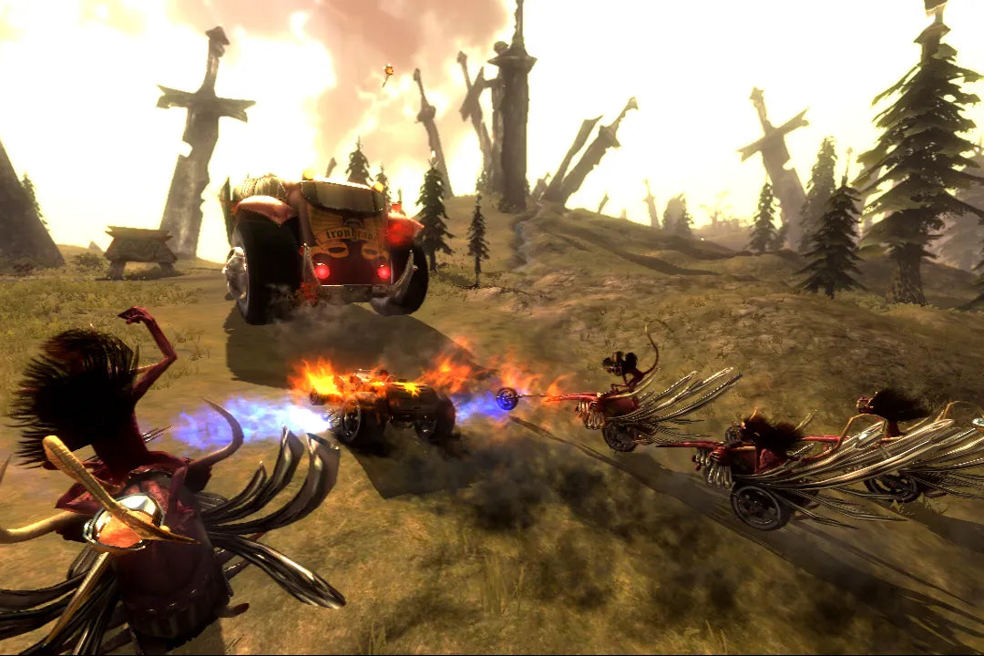 In Brutal Legend, you'll roam through a massive open-world born from the hell fires of heavy metal. In this world you can rev up any vehicle, rock its weapons, and crush the enemies of metal. You'll also learn to devastate with your guitar, playing face-melting solos that actually melt the faces of your enemies, command savage armies, bang skulls in hand-to-hand combat, and rise like a bat out of hell to command blood-drenched action from above. As if that wasn't enough, you can slay your friends and foes online, then play guitar licks on their graves! Of course, Brutal Legend is only complete with the most ultimate heavy metal soundtrack ever assembled in a game.
