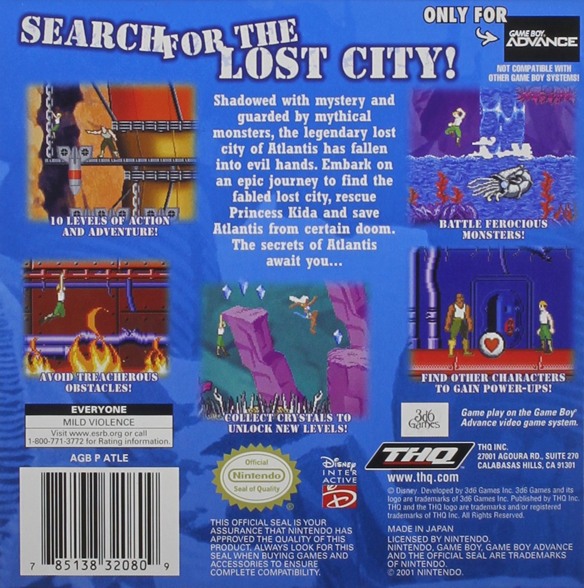 Disney's Atlantis: The Lost Empire for Game Boy Advance engages players in richly interactive gameplay as they battle through Atlantis in their attempt to rescue the city from its feared demise. As Milo, the hero from the animated motion picture, players are challenged in more than 15 levels of gameplay, including familiar environments and characters from the movie.