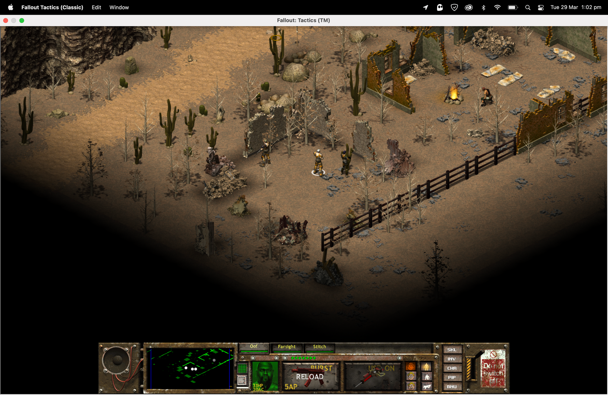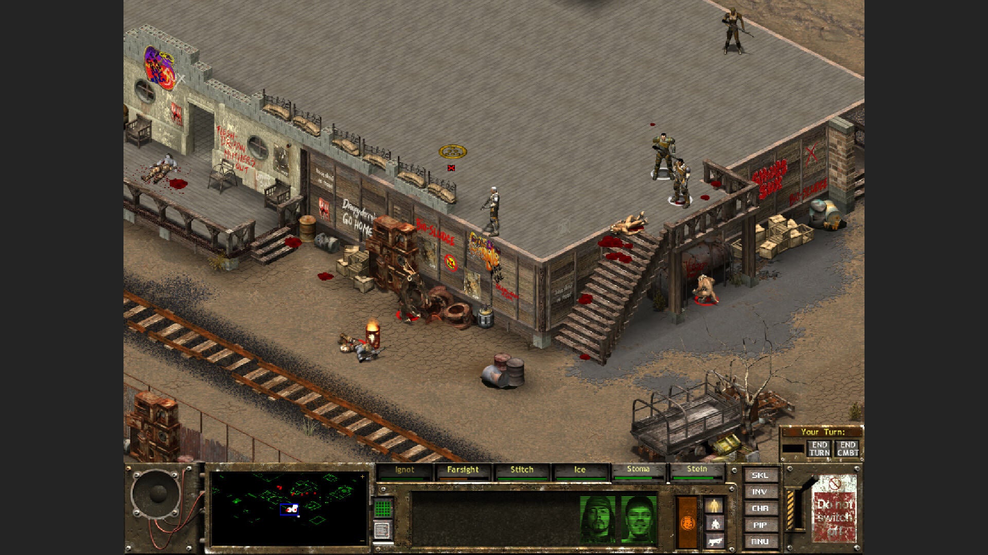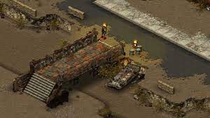 Instead of the one-man-against-the-wasteland story of Fallout and Fallout 2, Tactics sets you up as a junior squad leader in an expeditionary force of the Brotherhood of Steel. The Brotherhood is a no-nonsense group of soldiers that has managed to thrive in the nuked American landscape by maintaining strict control over its technological superiority. Your group split off from the main group and headed east in huge dirigibles, only to crash-land near Chicago. Trading technology and protection for food and recruits, the Brotherhood soon finds itself taking on the role of feudal overlord. You and your squad tackle increasingly difficult missions for the Brotherhood. Each successful mission lets you improve your character and squadmates by way of accumulated experience, weapons, equipment, and vehicles.