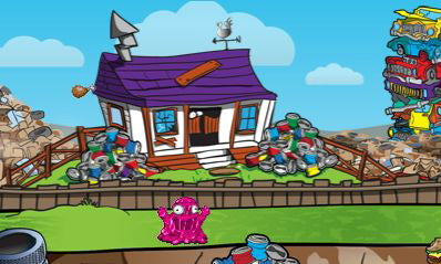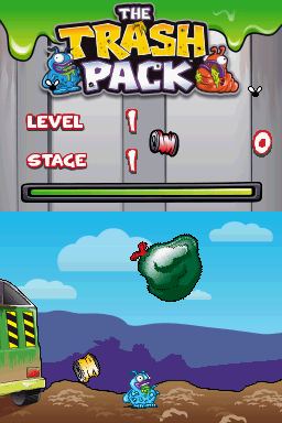 Comes with four mini games about taking out the trash. Each time you complete a mini game you earn "trashies" character. Operate a garbage truck to catch falling trash. Use a trashie character to eat bouncing/falling trash. Shoot items from a garbage can at overhead cranes/grapples to drop trash to collect it. Or try to throw a trashie character into trash cans. Fun addicting game.