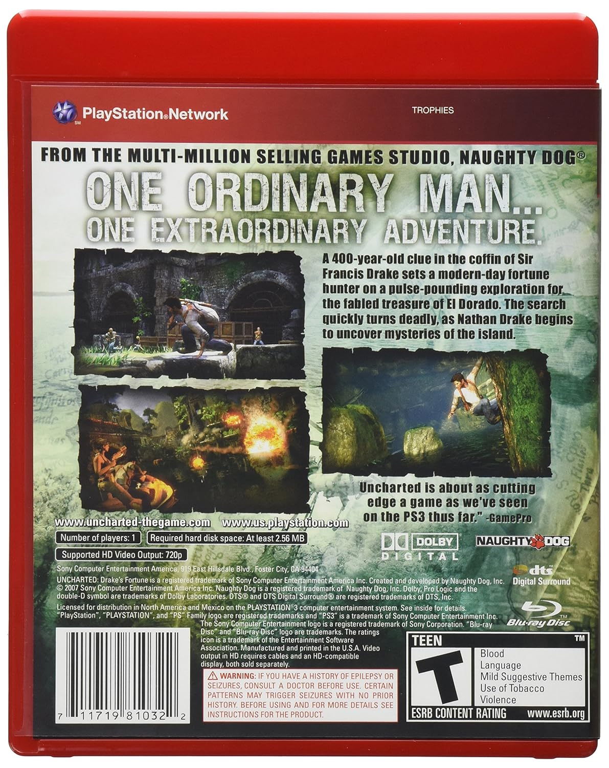A 400-year-old clue in the coffin of Sir Francis Drake sets a modern-day fortune hunter on a exploration for the fabled treasure of El Dorado, leading to the discovery of a forgotten island in the middle of the Pacific Ocean. The search turns deadly when Nathan Drake becomes stranded on the island and hunted by mercenaries. Outnumbered and outgunned, Drake and his companions must fight to survive as they begin to unravel the terrible secrets hidden on the Island. Using maps and ancient artifacts, uncover clues and unravel mysteries to find a forgotten island and a treasure that was thought to have never existed. Explore exotic locations. Traverse through living jungles and spectacular 400-year-old ruins. Drakes companions and allies play an important role in the adventure through cooperative mechanics, gun play and exploration. Experience fast-paced gunplay: use a variety of environmental elements for cover, shoot enemies off of moving vehicles in high speed chases and more. Use an array of hand-to-hand fighting moves to put your enemy off balance. Anything from wild haymaker punches to running drop-kicks.
